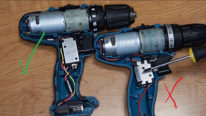 Разобрав шуруповерт первое, что бросается в глаза, это выключатель. На китайских подделках установлен тип старого образца лишь с парой проводов, также имеются двигатели с небольшим ресурсом работы и низкого качества.