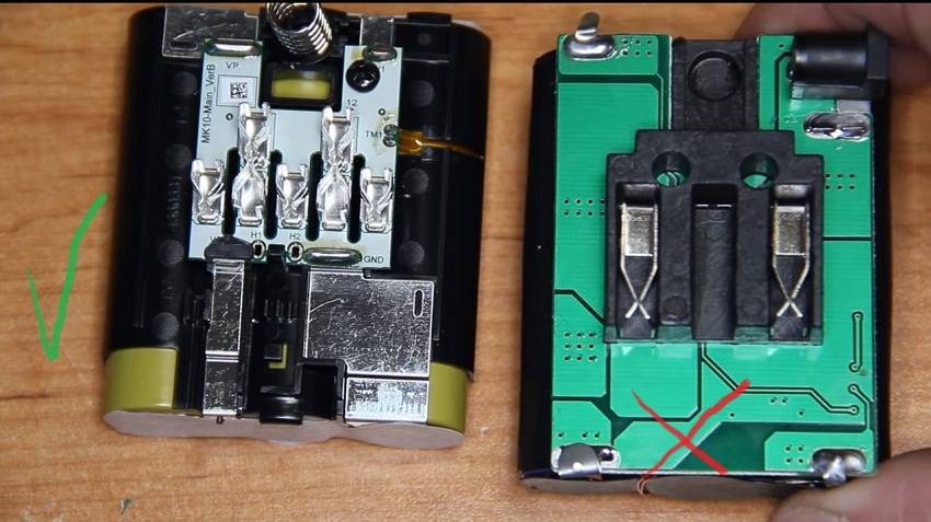Если разобрать батареи, то можно увидеть, что в подделке имеется блок зарядки и плата управления прямо в аккумуляторе. В оригинале же стоит лишь блок управления.