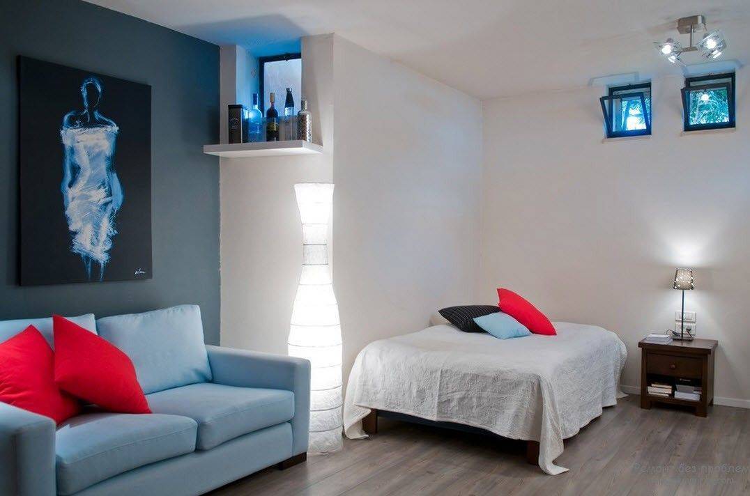 - В последние несколько лет стало популярным убирать все перегородки в малогабаритных квартирах, делать зонирование. В таких помещениях роль стен выполняют предметы мебели. Чтобы спальное место выглядело более уютно, можно около кровати постелить мягкий ковер.