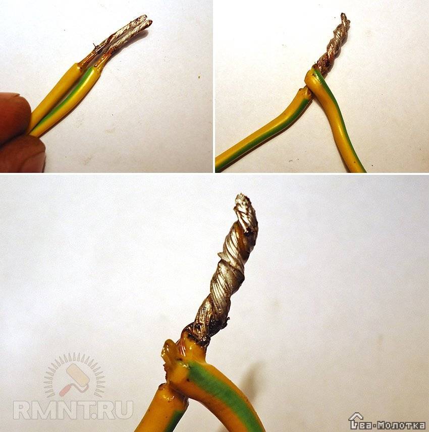 - Зачищается изоляция на нужной длине, проволочки тщательно, туго скручиваются между собой;