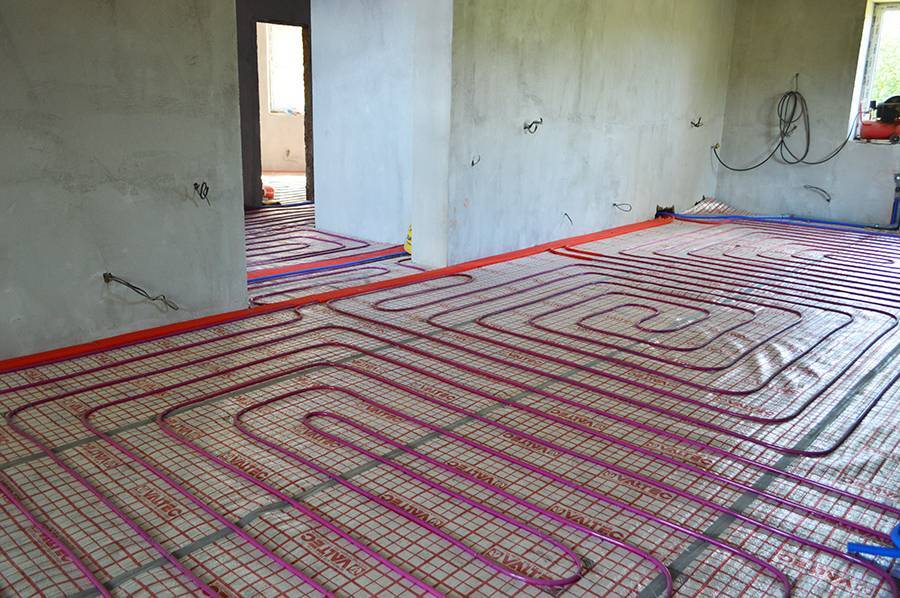 Монтаж теплого пола. Вся система состоит из труб (полипропиленовых или металлопластиковых) с диаметром 1,5–2 см. Трубы укладываются по спирали витками по периметру помещения. На середине комнаты витки разворачивают и укладывают обратку.