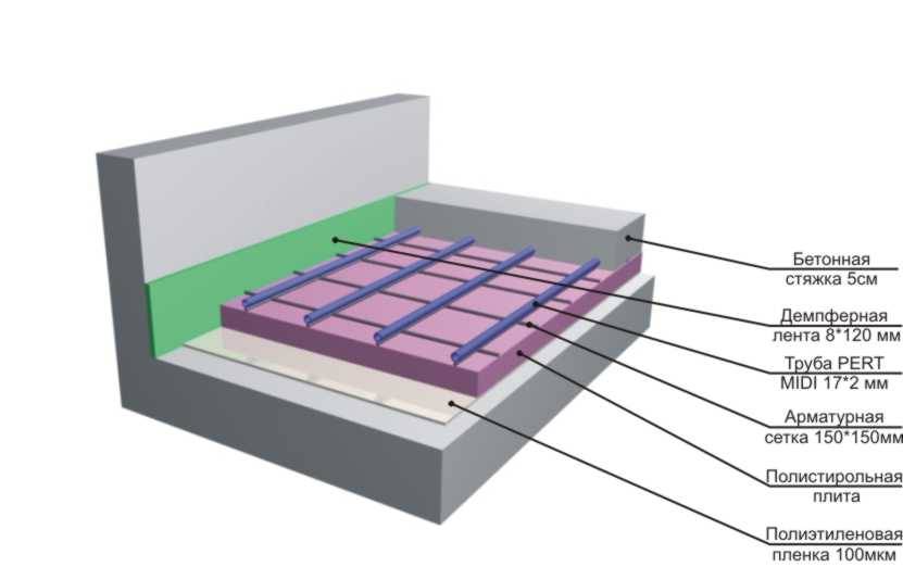 Для высококачественной прочности теплых полов по грунту с водяной системой, порог пола должен включать армированный бетонный слой, поскольку он будет служить защитой конструкции от дальнейших нагрузок. Перед заливкой нужно будет при помощи реек разделить основание помещения на участки, с шагом в 1 метр, что позволит упростить процесс работы, выполняя его поочередно. Далее укладывается армированная сетка и заливается раствор. По мере его высыхания, рейки необходимо вытащить из бетона, а углубления от швов заполнить раствором. Для того, чтобы в будущем бетон не трескался и не деформировал стены, по периметру помещения нужно проклеить демпферную ленту.