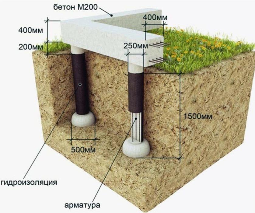 Опорами служат глубоко врытые столбы или сваи, заглубленные до отметки на 10 см ниже глубины промерзания. Лента из монолитного бетона на высоте 15–20см от поверхности грунта равномерно распределяет нагрузку на опоры.