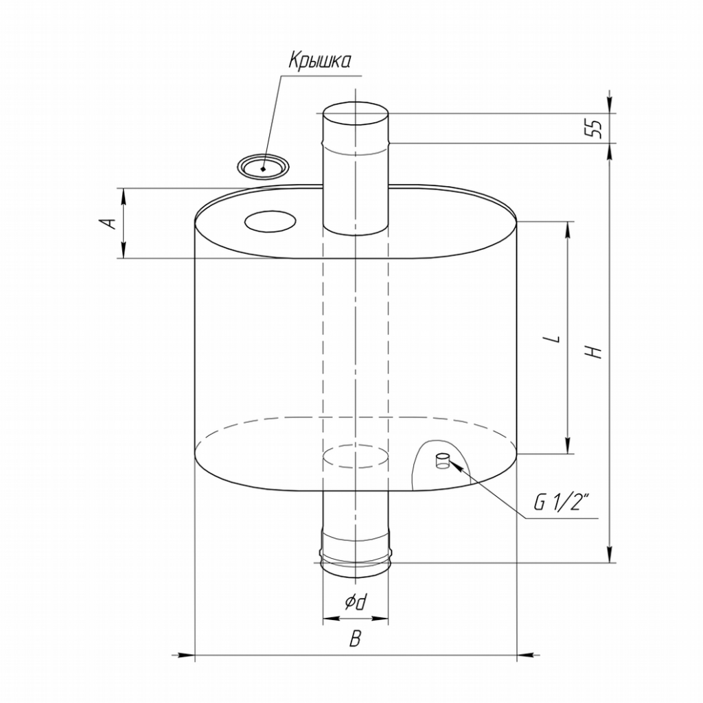 Емкость треугольной формы монтируется на дымоход. Для соединения она оснащена коленями ДУ-115. При изготовлении используется лазерная технология сварки, что обеспечивает надежность шва.