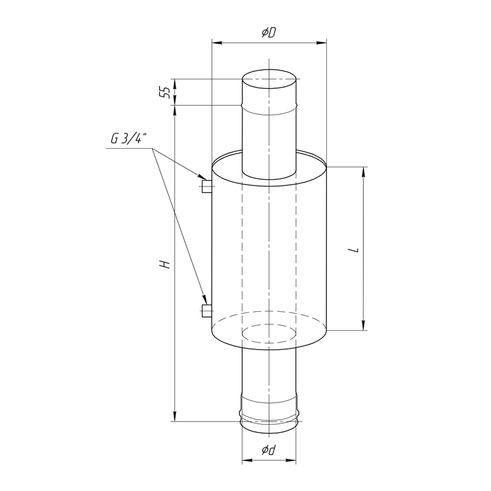 - при необходимости вверху аналогичным образом устанавливается переходник на основную трубу дымохода. Если переходник не нужен, то верх трубы бака соединяется с остатком дымохода отрезком трубы, подходящей по размерам;