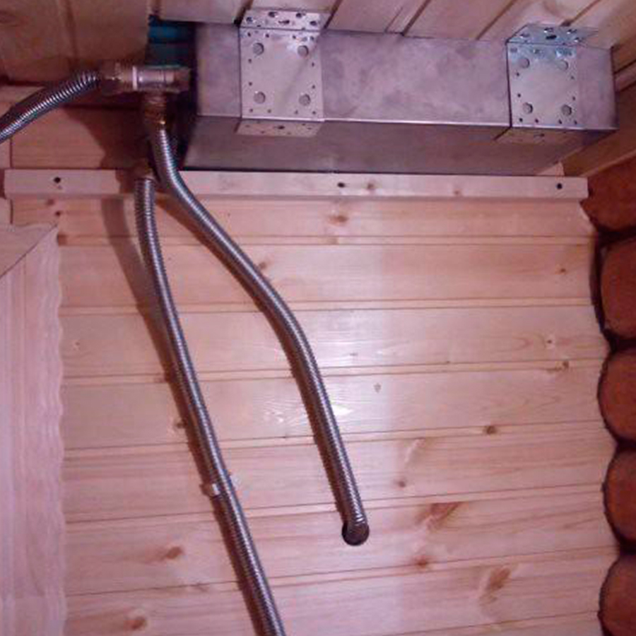 Далее в соответствии со схемой прокладывают по бане металлические гофры. Обычно условиями подключения требуется, чтобы трубы располагались к линии горизонта под углом не менее чем на 30о. Но на практике водогрейные емкости из нержавейки комбинированного типа нормально работают в бане, даже при уклоне в 10о.