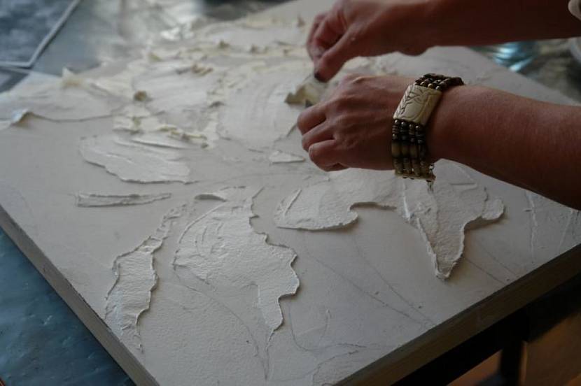 В ящик накладывают густую смесь в несколько сантиметров и начинают выписывать детали. После высыхания, добавляют смеси и увеличивают объем, продолжая мастихином обработку деталей. Так происходит несколько раз, пока не достигается заданная толщина элемента. Готовое изделие оставляют сохнуть, вынимают из ящика и монтируют на вертикальную поверхность. Второй вариант сложнее, для этого необходимо натренировать руку для работы с мастихином.