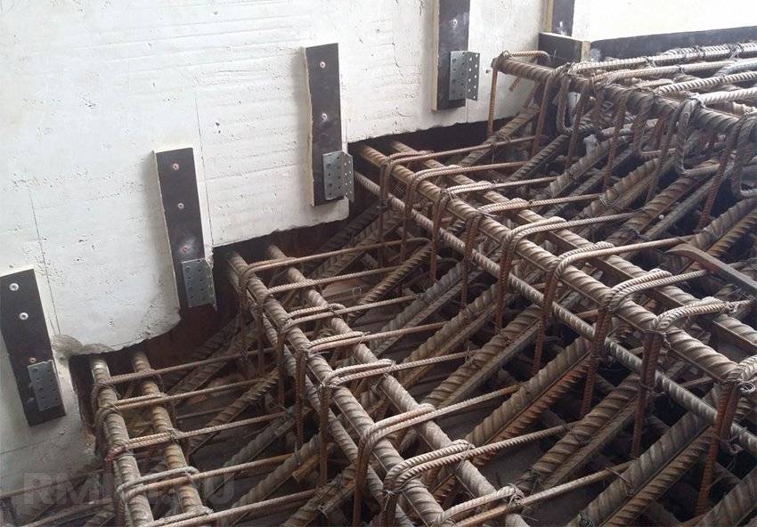 Крепление арматуры к закладным элементам в стенах выполняется не столько с целью обеспечить дополнительную опору, сколько ради монолитности строения и во избежание появления трещин при осадке здания. Однако к перекрытиям монолит лестницы должен иметь жесткое крепление посредством выпуска закладной арматуры на 60–80 мм.
