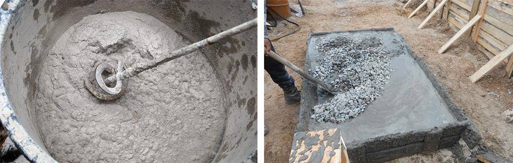 Компоненты тщательно перемешиваются в емкости вручную с помощью лопаты. Можно арендовать бетономешалку, чтобы ускорить выполнение строительных работ. Полученная однородная масса заливается в предварительно установленную опалубочную конструкцию.