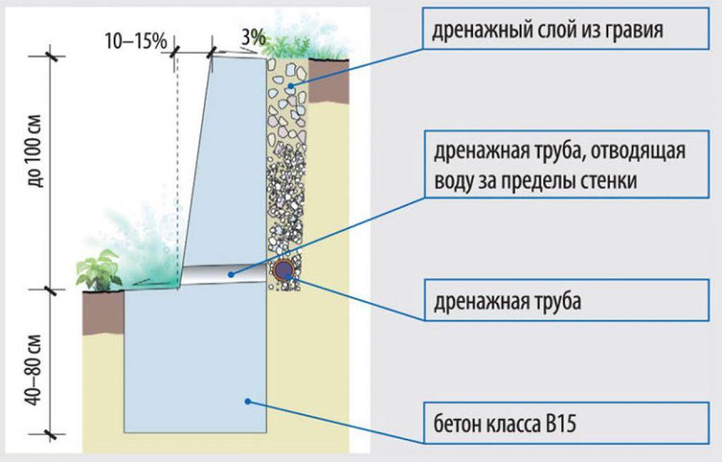 Требования дизайна. Подпорная стена, построенная из бетона, должна быть тщательно спланирована, она требует эффективную устойчивость и хороший дренаж. Это не проект для самостоятельного исполнения.
