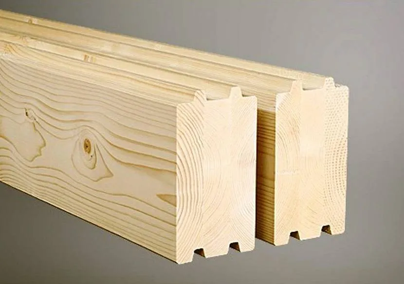 - На верхней и нижней плоскости бруса в процессе изготовления формируется профиль особой формы (наиболее популярны конфигурации «два шипа» и «гребенка»). Конфигурация профиля подбирается с таким расчетом, чтобы два бруса соединялись между собой практически без зазора.