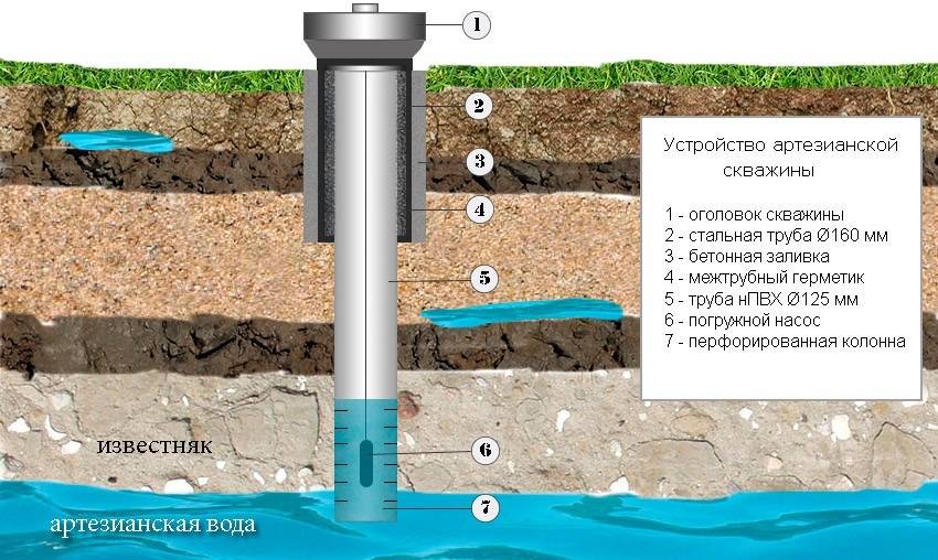 Водоносный известняк может находиться на глубине от 50 до 250 метров. В одном районе разница составляет до 150 – 200 метров. Существует мнение, что артезианская вода намного чище, чем песчаная. Это не совсем верно. Она немного чище, так как жидкость проходит больше слоев грунта. Главное достоинство артезианского колодца – высокая скорость наполнения и неиссякаемый запас воды. В известняковых породах жидкость находится под высоким давлением и при бурении она поднимается выше. Были случаи, когда вода сама выливалась через край горловины. Таким образом жидкость можно поднять на нужный уровень, чтобы иметь возможность установить насосную станцию или неглубокий погружной насос.