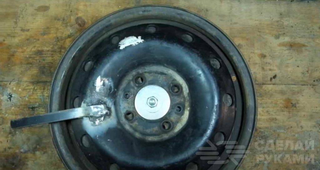 Берем первый автомобильный диск и вырезаем в нем середину. Потом крепим ее ко второму диску (основанию печи) — получилось своего рода поддувало. Привариваем к задвижке ручку из металлической полосы.