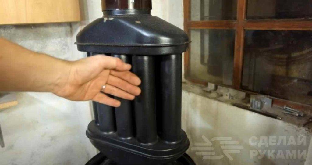 Между трубой и дымоходом мастер установил радиатор — для лучшего обогрева помещения.