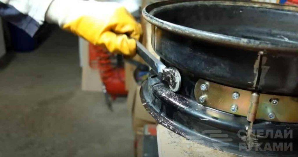 В первом диске вырезаем дверцу, и крепим ее при помощи петель. Свариваем два обода вместе, установив их друг на друга (как показано на фото ниже).