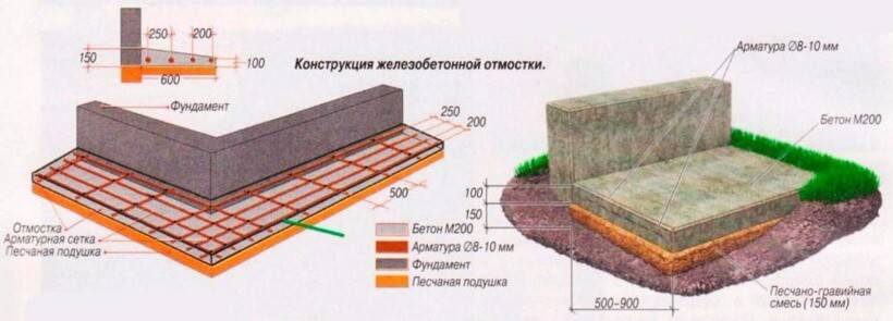 Опоясывающая защитная конструкция должна иметь одинаковую ширину, величина которой на 20 – 30 см превышает вылет карниза кровли за стену постройки. Принято считать, что она составляет около 1 м (и более на проседающих грунтах). Заглубляется отмостка не более чем на половину глубины промерзания грунта в данной местности. Толщина бетонного покрытия выбирается в пределах 7 – 10 см (до 15 см, если используется как дорожка).
