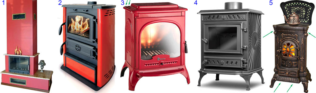 И третье: чтобы как можно полнее использовать тепло пламени для обогрева, декоративно-отопительная чугунная печь-камин должна быть снабжена контуром воздушного отопления. Его входные и выходные окна могут быть на самом виду (поз 1 на рис.), сбоку (поз. 2) спереди и сверху (поз. 3), частично (поз. 4) или полностью (поз. 5) замаскированы декоративными деталями. Но обязательно – особенно если берете печь б/у без спецификации – убедитесь, что выходные воздушные окна есть. Тогда и входные точно отопительные, а не только приточные топочные.