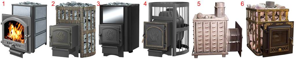 Конструкции банных печей сложились вполне и ничего принципиально нового в них за последние годы не внесено. Печи Вулкан чугунной серии Легенда (поз. 1-4 на рис.) и Гефест (поз. 5 и 6) неспециалист на глаз не отличит друг от друга. Марки чугуна, из которого они изготовлены, найти трудно – ноу-хау фирмы. Но их создатели соблюдают основной принцип конструирования банных чугунных печей: не гнаться за прочностью чугуна. Чем меньше в нем углерода, тем лучше чугун пропускает ИК, необходимые для прогрева каменки. Исключение – вентилирумая каменка, но в сауне ее нужно греть очень долго, а в русской бане ядреного пара от нее не получишь. И в то же время низкоуглеродистый чугун более жаропрочен. Поэтому, если будете выбирать банную печь по марке чугуна, смотрите. Чтобы первое число в ее обозначении было ближе к указанным выше нижним пределам.