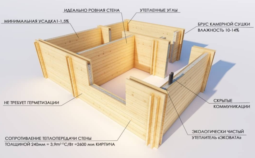- от брусовых – легкость сборки и четкую геометрию;