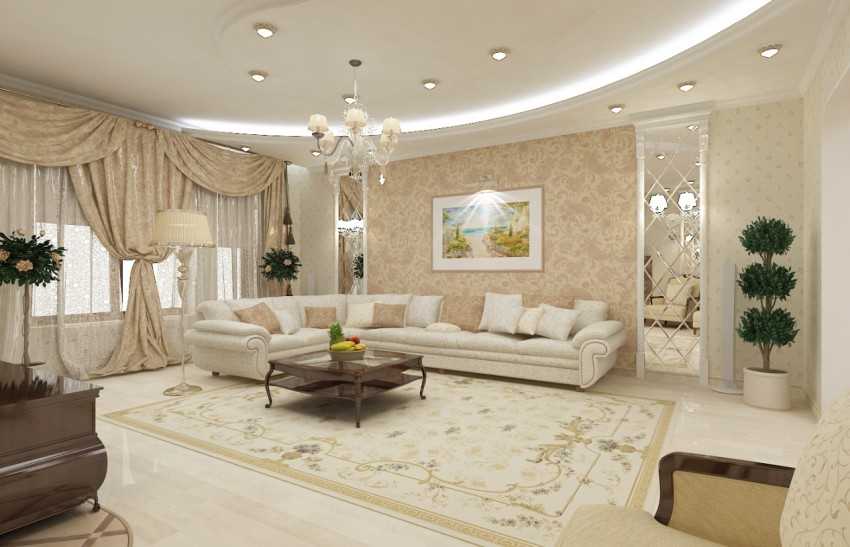 Чтобы в гостиной было достаточно светло, используют разные светильники: точечные, люстры, торшеры. Встроенные модели подходят больше для современного стиля, а для классики нужна эффектная люстра.