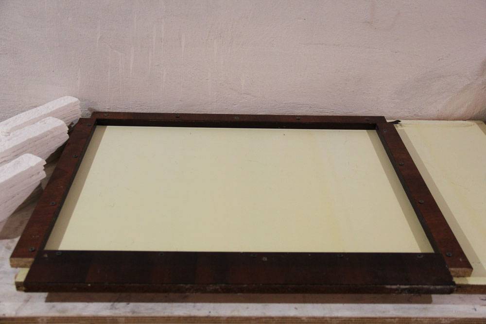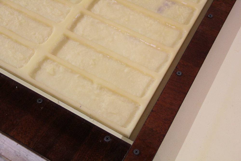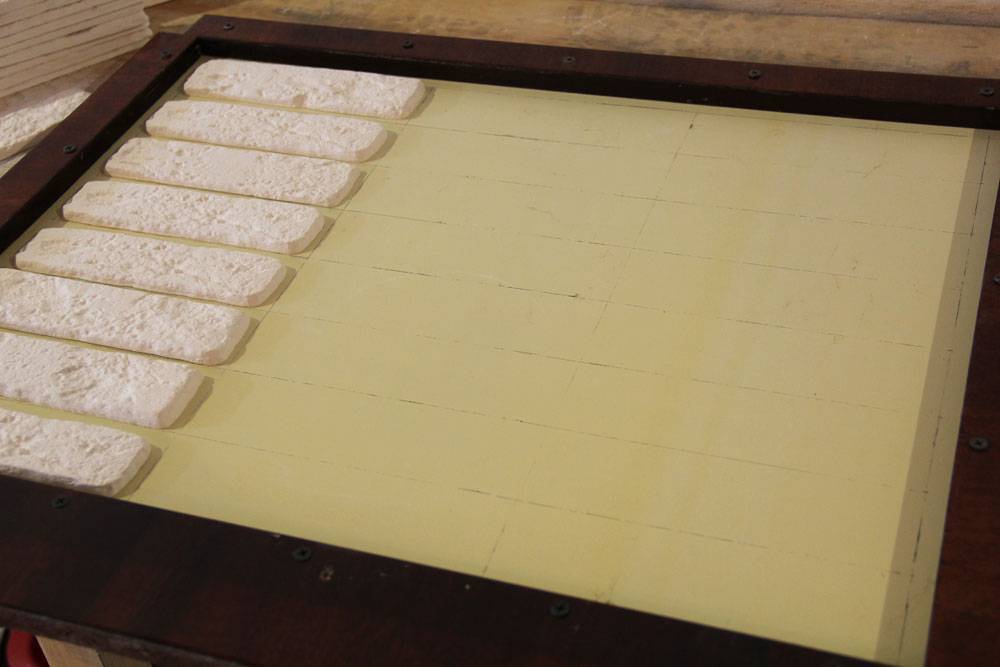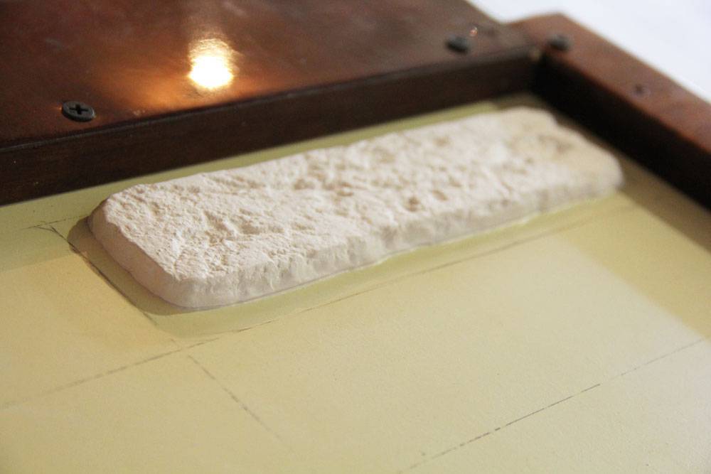 * Матрица располагается на столе и проверяется уровнем. Она должна быть расположен строго горизонтально, в противном случае камни получатся разной толщины.