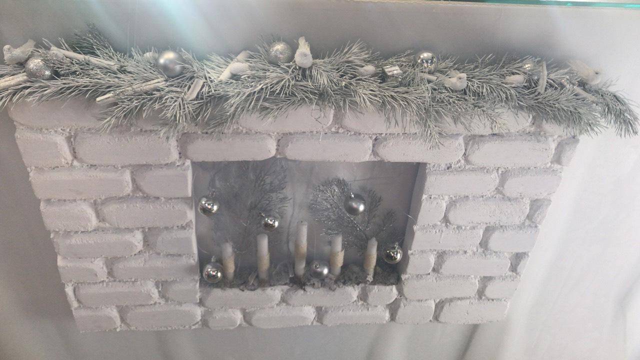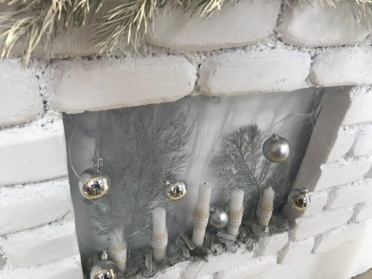 Устанавливаем камин возле стены и приступаем к декорированию. Для этого можно использовать еловые веточки, мишуру, красивые свечки и другие праздничные атрибуты.
