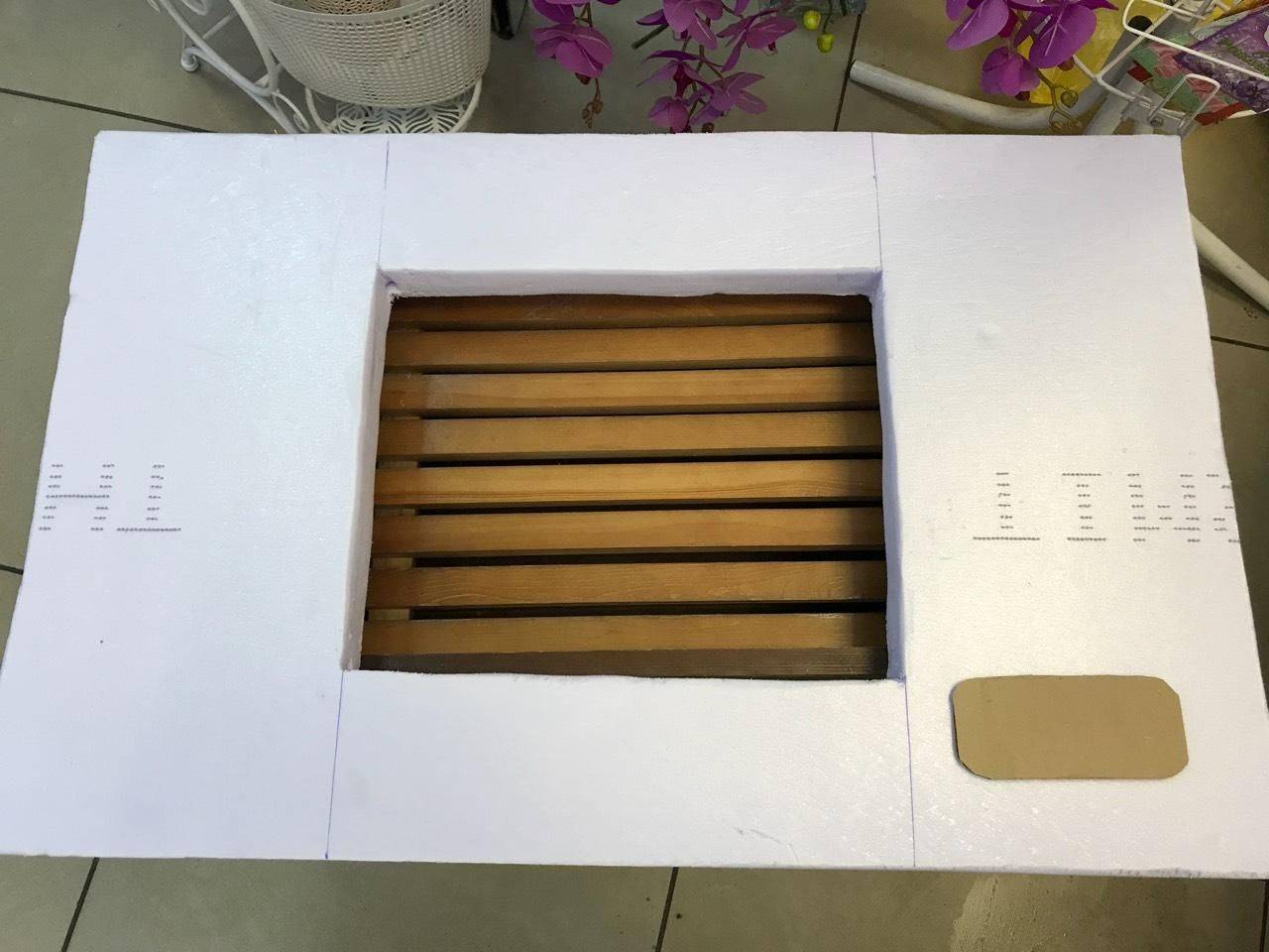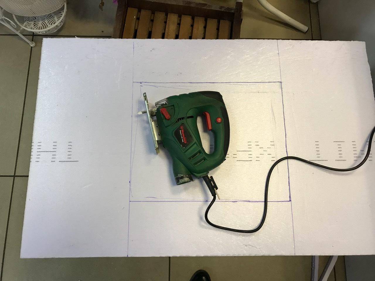На листе пеноплекса делаем разметку и вырезаем окошко для камина.