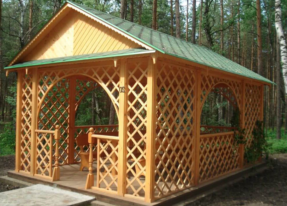 Этот материал доступен, экологичен и достаточно распространен, кроме того, он обладает отличными прочностными и изолирующими характеристиками. Ценят древесину и за превосходный внешний вид, благодаря которому из нее можно сделать декоративную решетку для беседки. Такой архитектурный элемент завершит экстерьер строения и придаст ему оригинальности и самобытности.