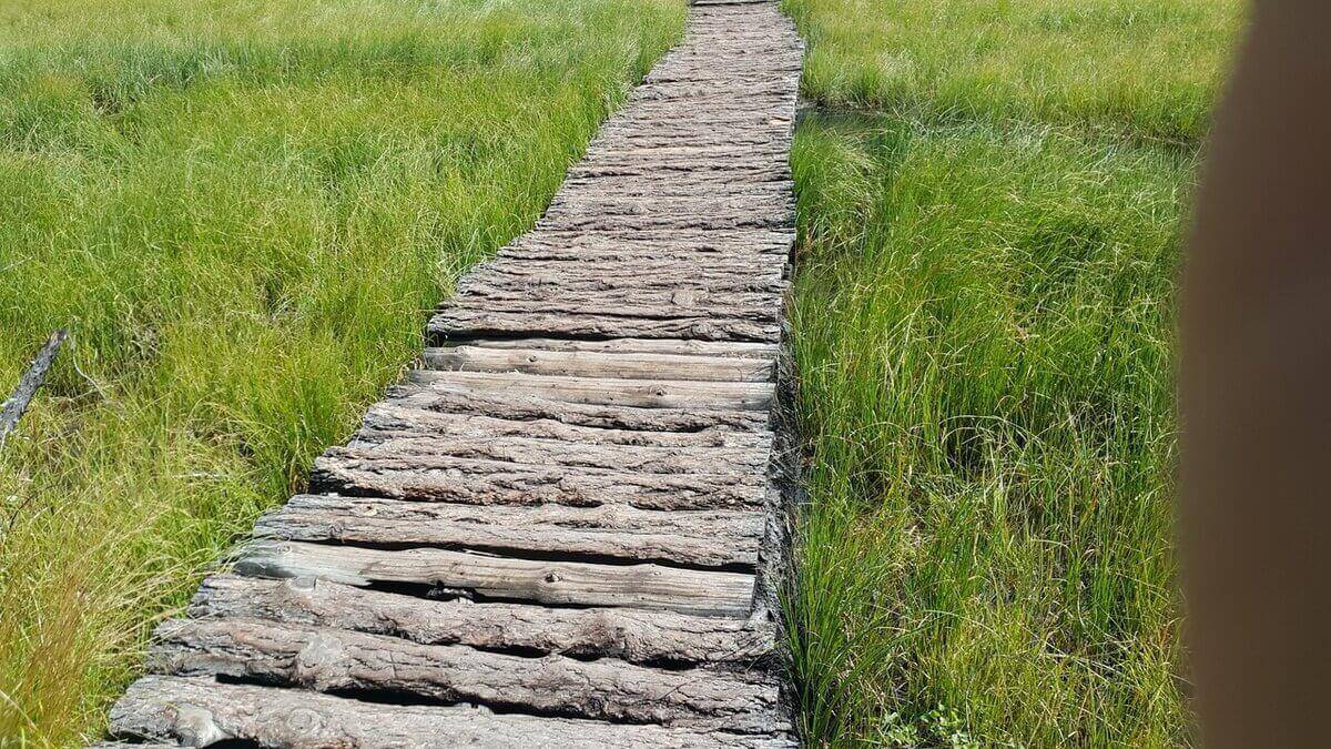 Если ширина тропинки не имеет значения, зато важно сделать все как можно быстрее, можно укладывать лаги поперек траектории, а настил – вдоль. В качестве лаг можно использовать бетонные или деревянные шпалы, поскольку они не боятся влаги и не требуют устройства насыпи