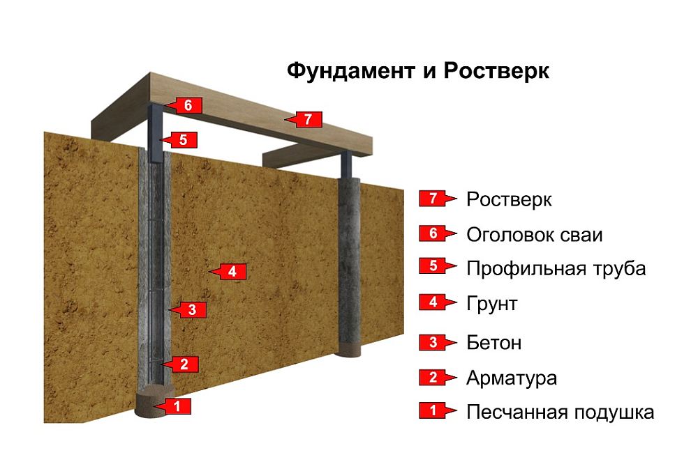 Ростверки предохраняют от смещения грунта. Они противодействуют нестабильности конструкции при замерзании-оттаивании и обеспечивают жесткую сцепку конструкционных элементов здания. Сваи монтируются в точках, где предполагается самая большая нагрузка, их длина зависит от глубины промерзания почвы.
