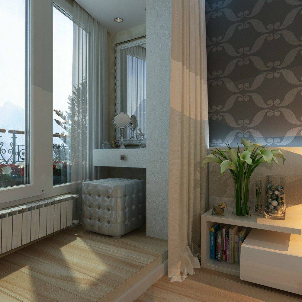 Для спальни, которую можно обустроить только кроватью, шкафом и тумбочками, присоединение даже небольшой дополнительной площади является прекрасным вариантом для создания уютного уголка. Совмещенная лоджия выступит в роли мини-гардеробной, цветочного сада, рабочего места или дамского будуара с туалетным столиком и пуфами.