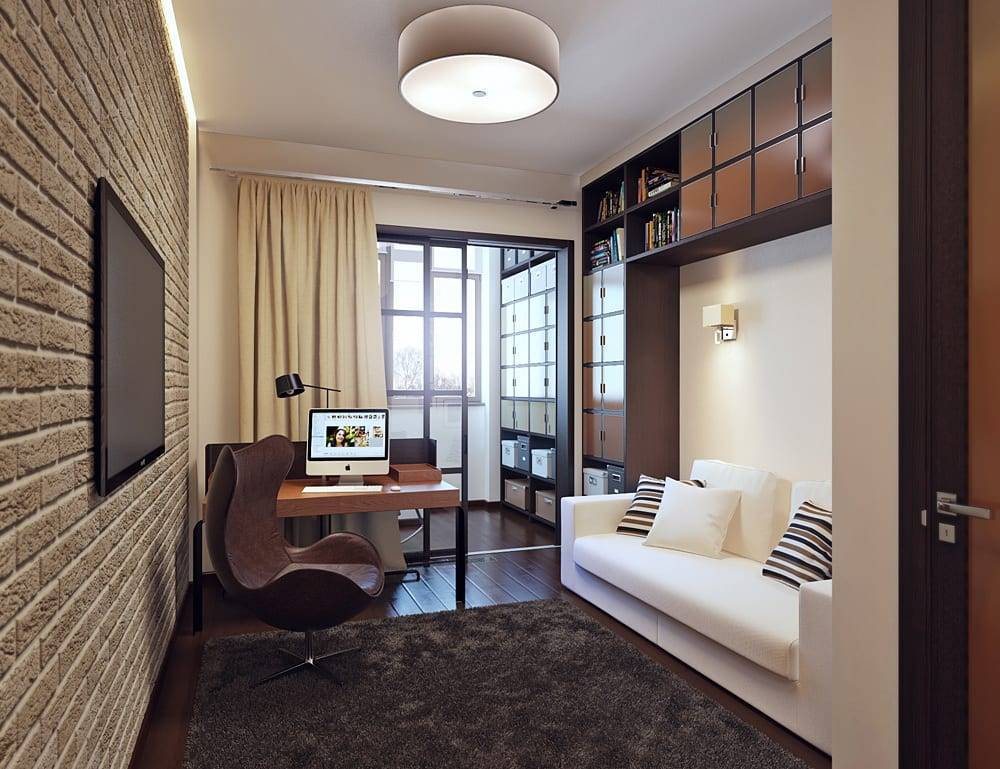 В полноценном кабинете хорошо смотрится угловой стол. На торцевой стене над столом можно закрепить полки. На маленьком балконе можно оборудовать стол-подоконник. Для отделки стен подходят обои, древесина, МДФ. Тона следует выбирать теплые, пастельные. Пол желательно покрыть ворсистым материалом (например, ковролин).