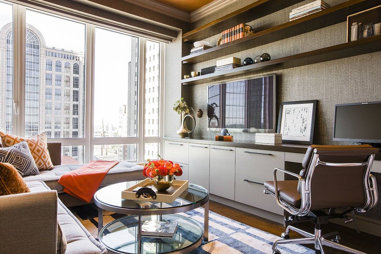 Важно правильно разместить мебель. Здесь обязательно должен быть удобный стол, полки или стеллаж, кресло и стулья для гостей