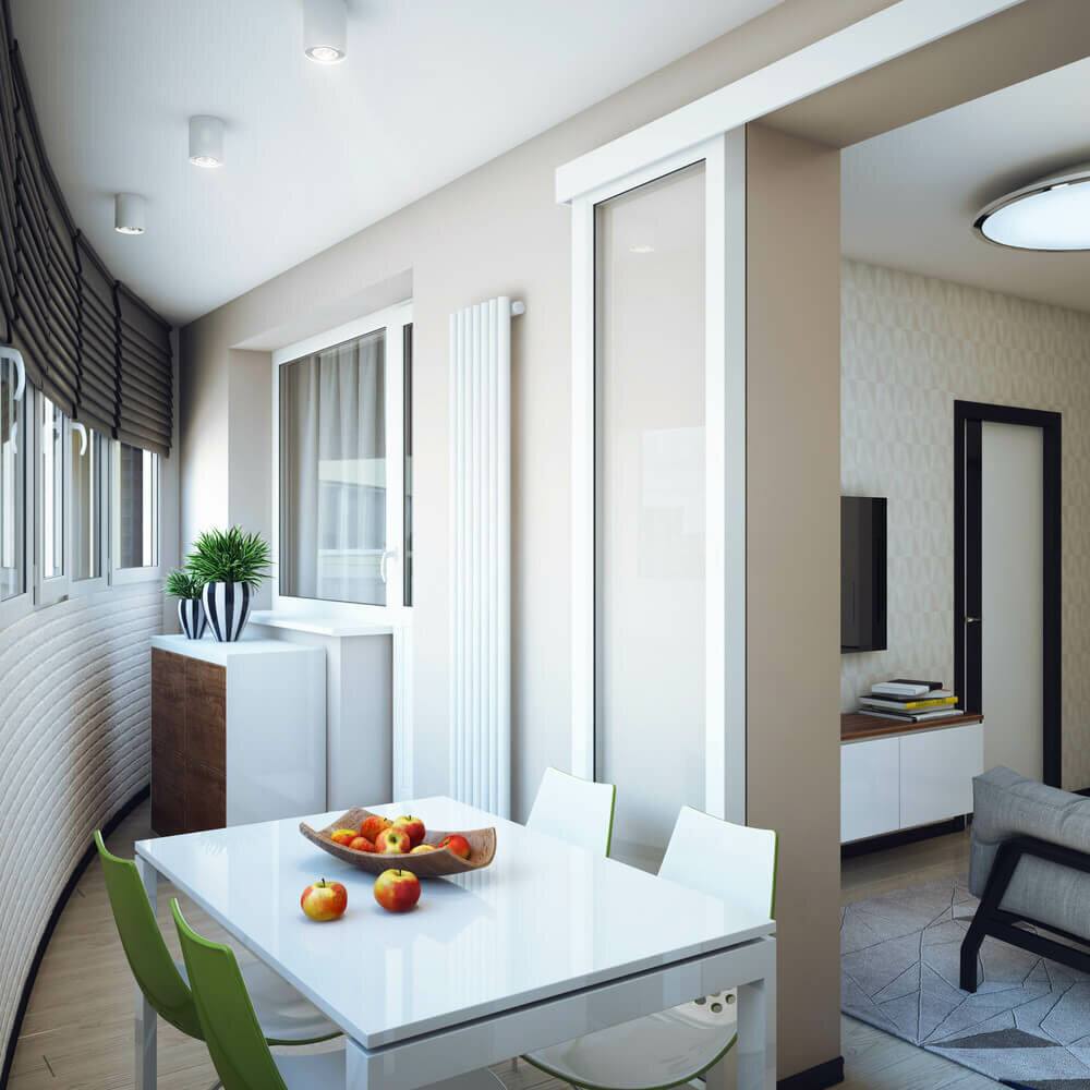 Кухонную зону редко, когда можно вынести на территорию балкона, а вот столовую вполне можно. Иногда в этом помещении обстраивают миниатюрную спальню. Оригинальное решение – вынести в эту зону мастерскую.