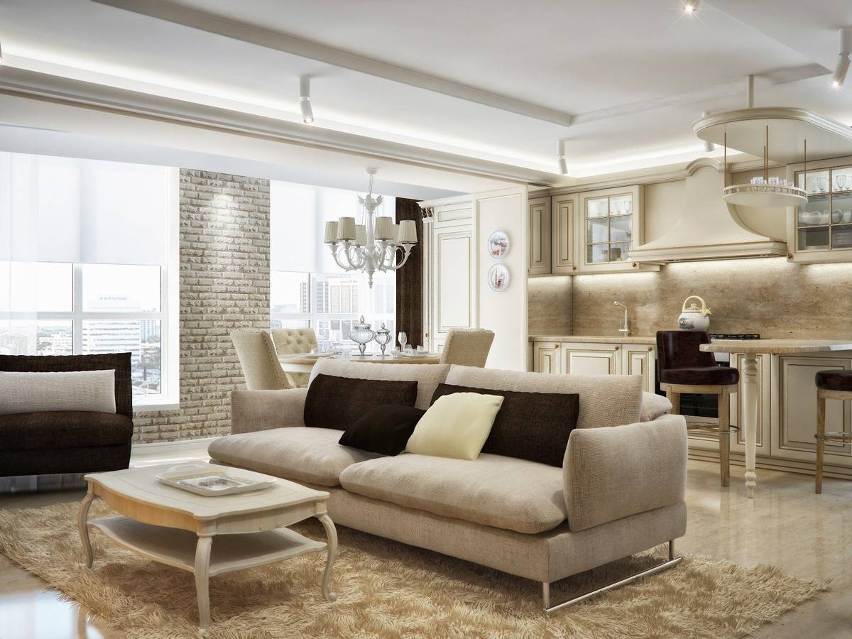 Есть универсальные варианты по оттенкам интерьера, которые придадут совмещенной кухне-гостиной стильный облик.