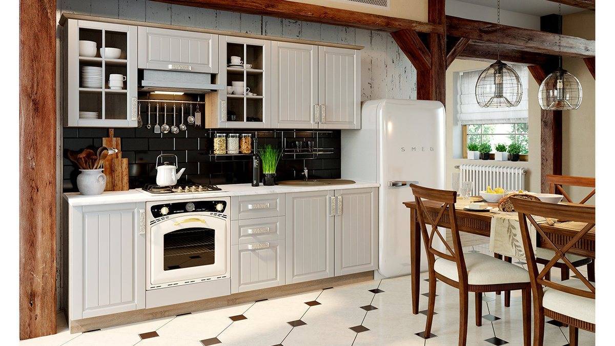 Выбеленная фурнитура на мебели создает ощущение старины. А если пол будет из терракотовой плитки, то придаст кухне яркости и открытости.