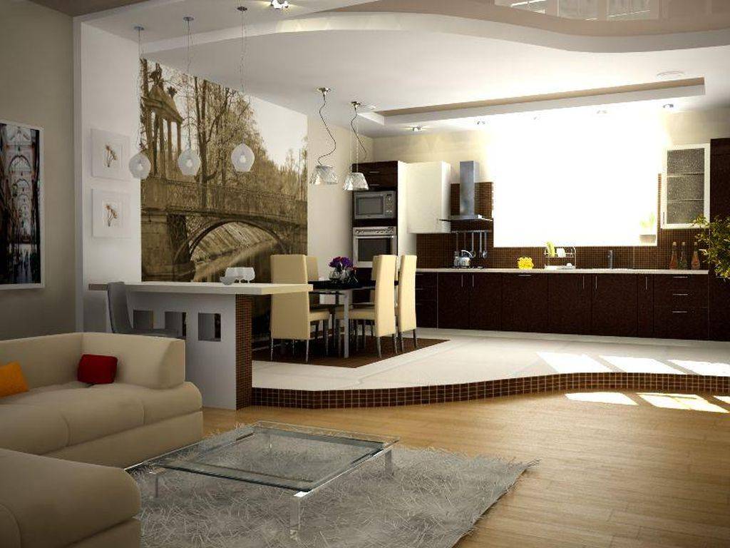 Поделит пространство и перепад уровня пола, разная расцветка стен или освещение. Например, в кухне пол из плитки, а в столовой – ламинат. Или в кухне яркий свет, а в гостиной – мягкий приглушенный.