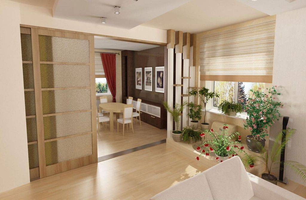Во втором случае оконный блок демонтируют и получают единое пространство. После такой перепланировки получается очень светлая кухня-гостиная. Акцент на зоне отдыха можно сделать, приподняв ее на невысокий подиум. И в том, и в другом случае требуется разработка дизайн проекта. К сожалению, согласовать такой проект официально не получится.