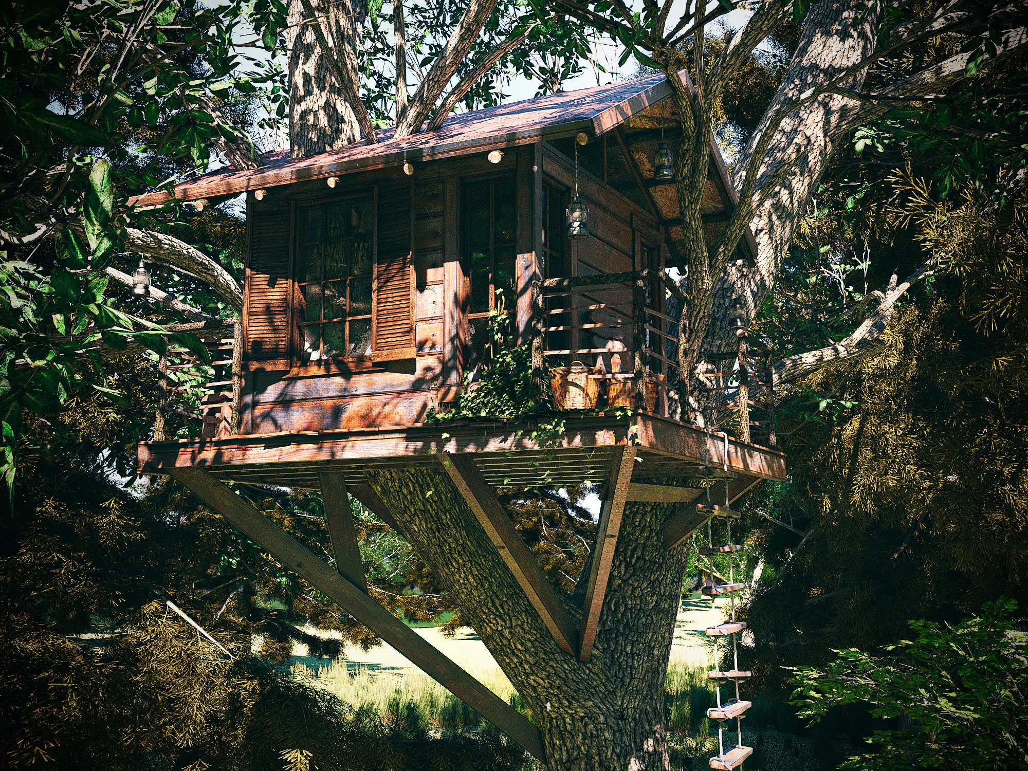 Чтобы попасть в такой домик, нужна будет лестница. Она должна быть очень надежной, быть с прочным креплением и при этом лишь украшать внешний вид сооружения. К стволу прибивать лестницу нельзя, так как это крайне губительно для дерева, кроме того, дерево растет, и его конструкция будет сильно деформироваться.