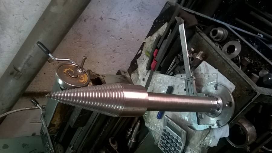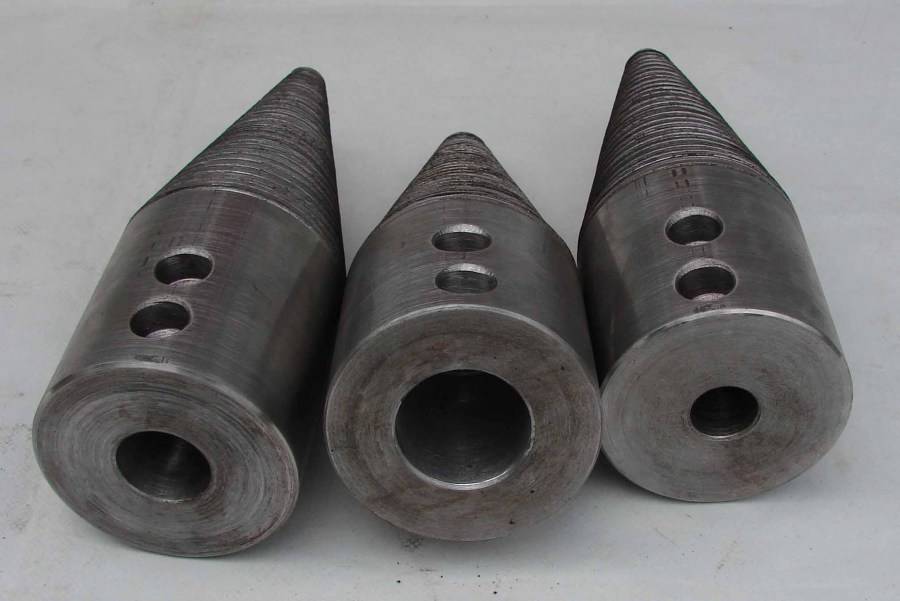 Режущую часть можно купить или самому выточить, если у вас есть навыки токаря. Помните, что наличие резьбы облегчит вам работу с дровоколом, поэтому желательно её нарезать (рекомендуем левую нарезку). Глубина резьбы 2−3 мм, шаг 6−7 мм. Нос у конуса должен быть острозаточенным. Место посадки на редуктор должен иметь глубину не менее 70 мм.