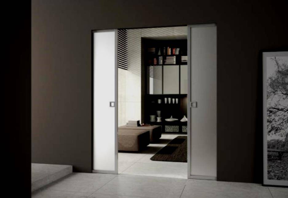 Конструкция, предназначенная для дверей в смежные помещения, располагающая одной кассетой, которую встраивают в стену между дверными проёмами. Полотна смещаются независимо друг от друга и прячутся в стену.