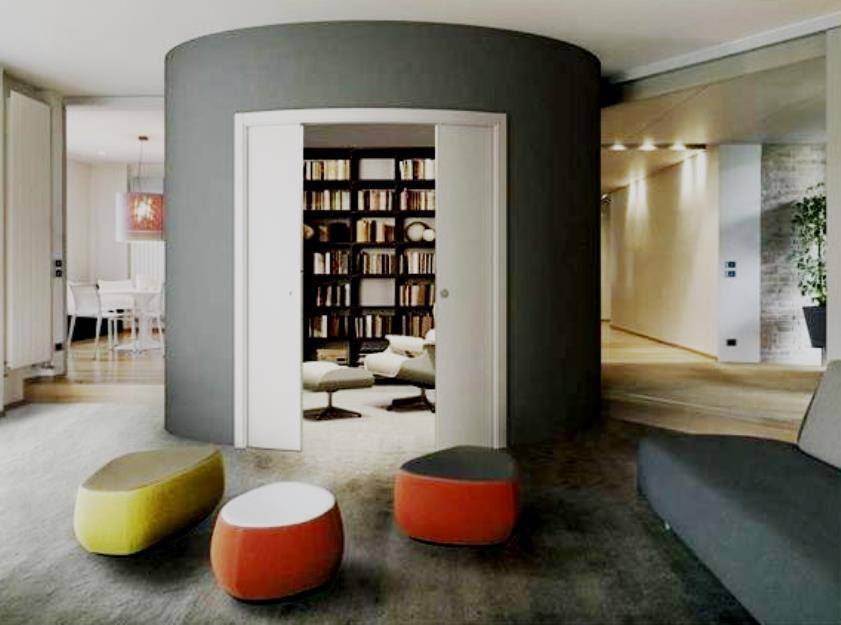 Раздвижные двери, задвигающиеся в стену — хороший вариант сэкономить место занимаемое обычной дверью, но отбирают сантиметров 10 толщины комнаты за счет кассеты. Поэтому идеальный вариант для их установки — монтировать встроенные двери вместо самонесущих стен.