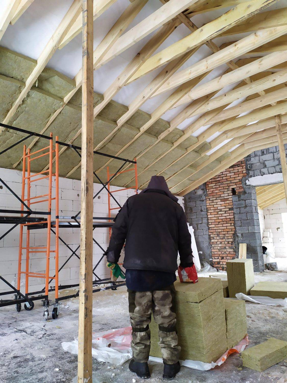 Очевидно, что сравнительно не сложно разместить утеплитель в каркасе, распределив его стыки в шахматном порядке. Для этого изначально создавались все условия: постоянно контролировалось расстояние между стропилами, уложена кровельная мембрана.