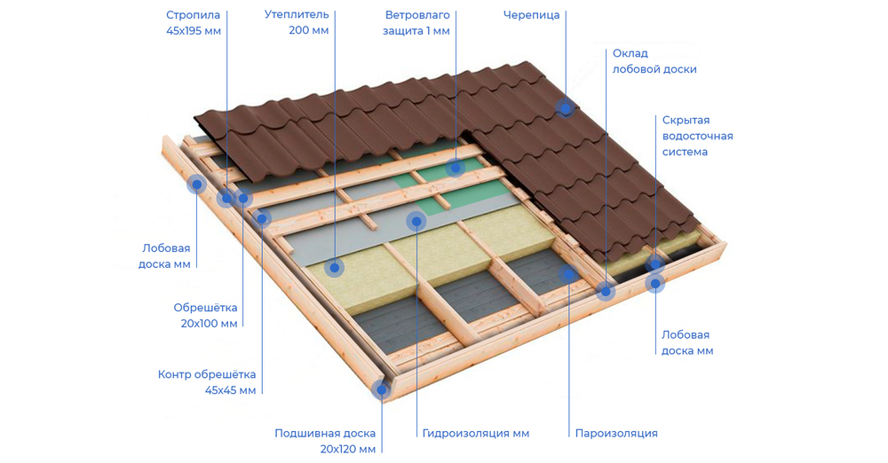 Красивая скатная крыша со стропильной системой имеет широкие свесы, которые выполняют защитные свойства.