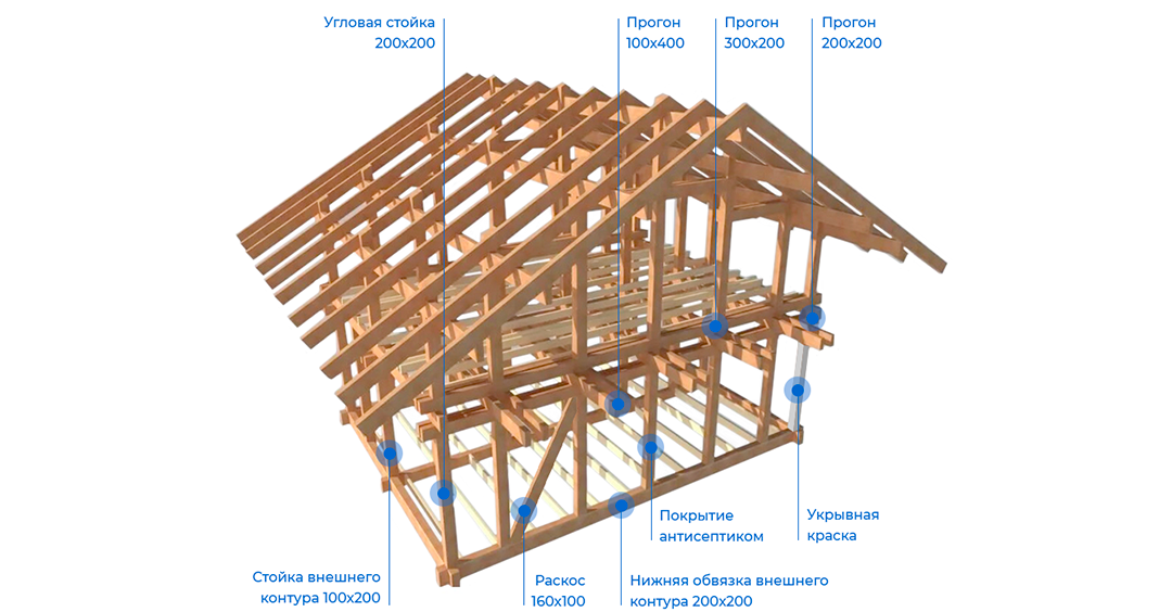 - Боковые стены состоят из стропильных ферм (конструкций из балок чердачного перекрытия и стропил).