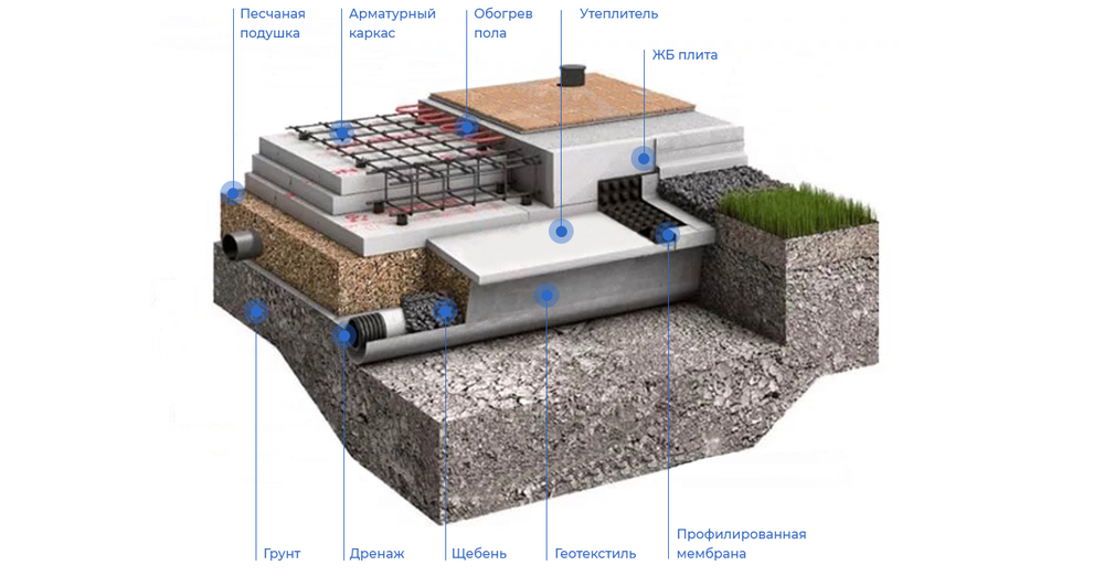 - теплый пол уже интегрирован в толщу фундамента – экономия на отоплении до 50%