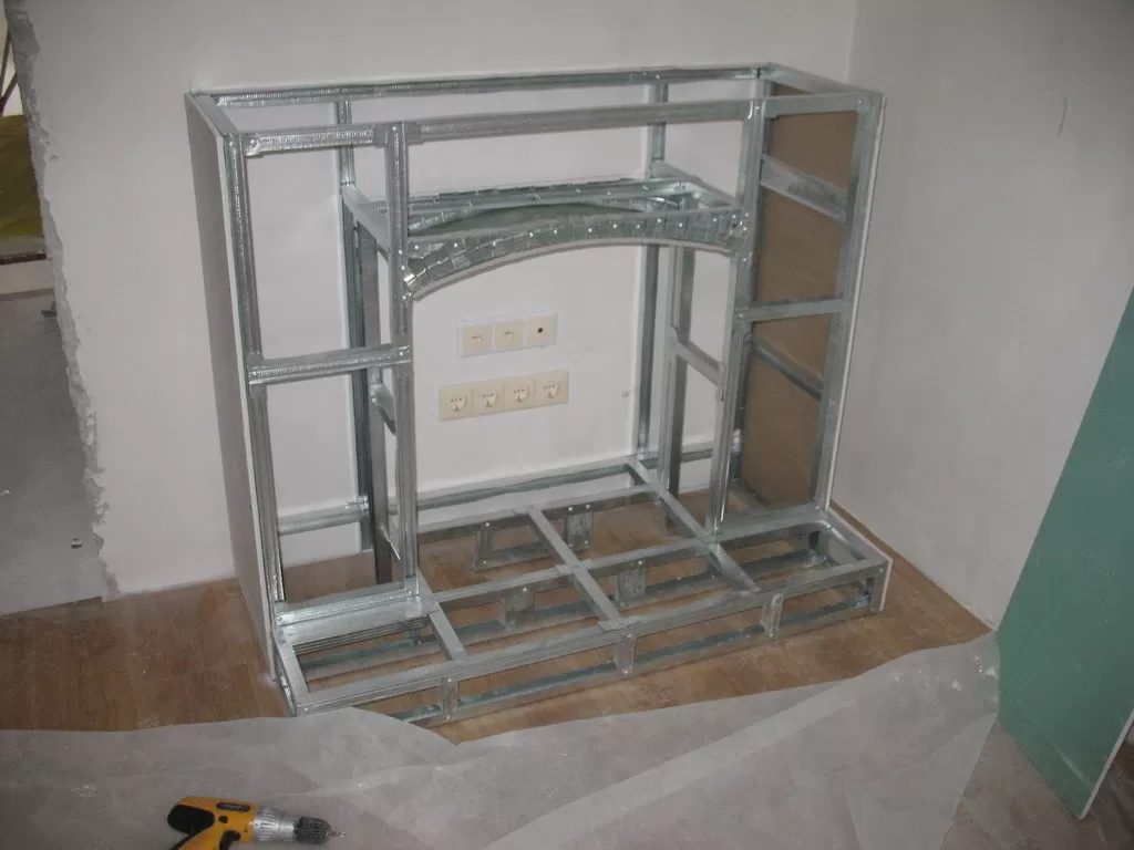 «Внутренности» каминной конструкции собираются отдельно. Если портал выполняется арочным, для его создания потребуются гибкие перфорированные профили, которые укладываются по контуру уже вырезанных деталей.