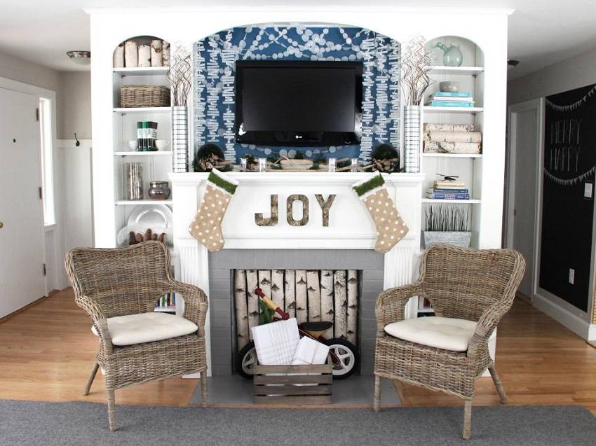 Внутри поддельного камина размещают настоящие свечи в металлических подсвечниках, яркую соляную лампу, светодиодную ленту по периметру портала. Внутрь сооружения помещают поленья или их имитацию из картона, старинные сундуки и прочитанные книги, обувные коробки и корзины из сосновых корней, внутри которых хранятся сувениры либо настольные игры. Для красоты их расписывают под березовые дровишки с корой.