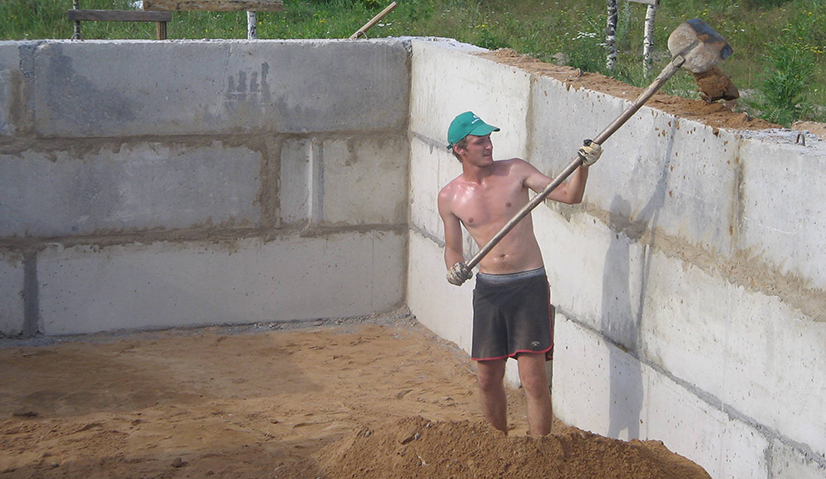 Необходимо тщательно утрамбовывать подушку-основание под фундамент, постоянно смачивая его, что предотвратит «хождение» конструкции.