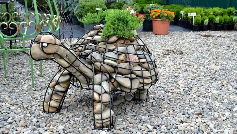 Материал подбирают по цвету, виду, размеру, причем, важно, чтобы единица наполнителя была на 60% крупнее, чем размер клетки каркаса. Металлическая сетка, из которой изготавливают стенки сооружения должна быть изготовлена методом двойного кручения, покрыта антикоррозийным составом, иметь толщину не 4 мм. Ячейки могут быть квадратные, прямоугольные, в форме шестигранника